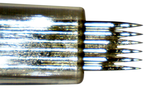This 6-flat REVO Needle for the Skinmaster 7 and Deluxe is popular with seasoned professionals. Use wide or like "ducks in a row", this needle carries lots of color between the tips. It can also be used as a brush or a shovel or even tapping.